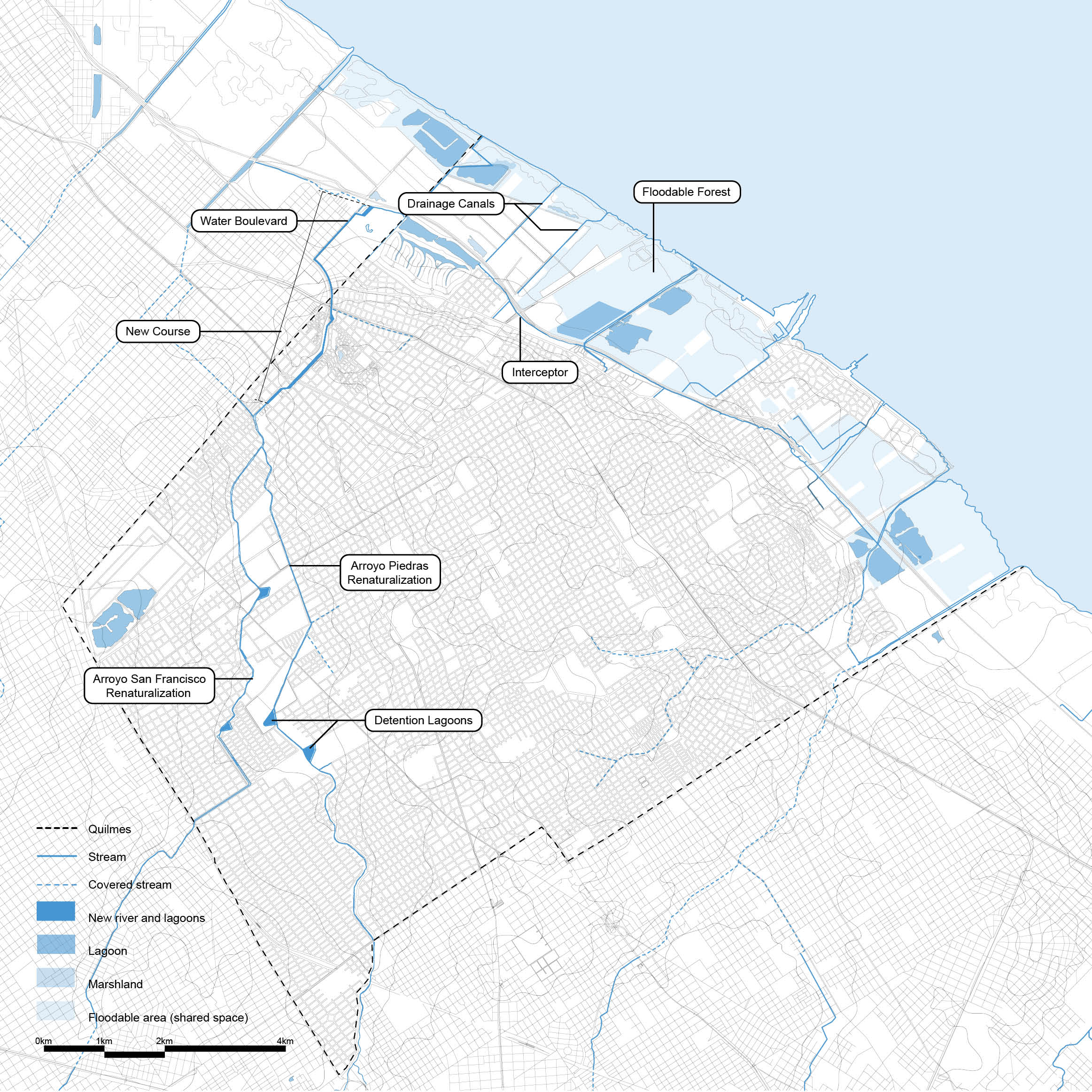 The hydrological system of Quilmes is a complex system of streams and rivers running through the entire city. The main hydrological characteristic of the city is its location on the bed of La Plata River. This means there is a need of a deep understanding of its riparian character. The morphology of the floodplain, the flood logics and the ecosystem of the place has to be reconsidered as it has been ignored or even harmed. It is the case of the floodplain, where artificial lagoons have been excavated and the marshy character of the place has been damaged by urbanizing the area and polluting the ground.